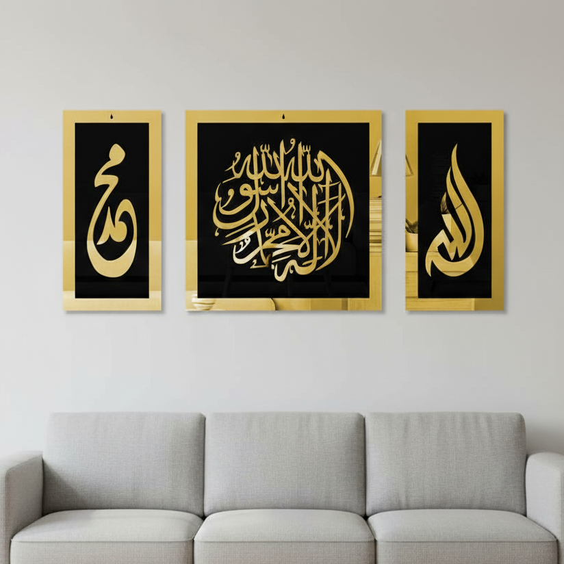 Add a spiritual yet luxurious touch to your living space with this premium Islamic wall art. Designed in bold gold and black tones, this three-piece calligraphy set beautifully represents elegance and faith — perfect for enhancing any modern home interior.